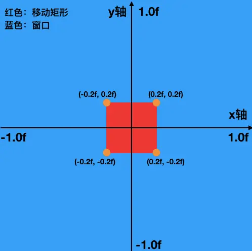 窗口坐标系默认是从 -1.0f 到 1.0f,中央是坐标原点,而我们的矩形起始位置的中央也是原点,边长为 0.4f,所以顶点坐标为: