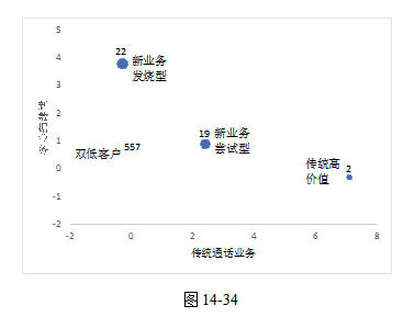 客户的多维属性是客户分群的一种重要方法,这种方法是RFM模型的自然延伸。RFM模型每次仅能进行一个维度的分析,也就是说只能分析客户在一个业务上的分类情况。如果希望进行多个业务消费行为的比较,就需要对每个业务使用情况通过RFM模型构造变量。如图14-34所示,使用传统通话业务及新数据业务的情况可以细分为双低客户、新业务发烧型、新业务尝试型以及传统高价值。这里需要注意的是,一般每个业务使用情况的变量都是同类指标,要么都是使用频次,要么都是消费额度。