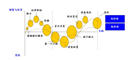 个人客户所处生命阶段的变化,会产生不同的金融服务需求。例如一个刚毕业并初入职场的年轻人,会有一定的储蓄。一般年轻人风险承担能力较高,可以适当地投资一些风险回报较高的资产,比如激进型基金理财产品。当到谈婚论嫁并购置房产时,这个年轻人开始首笔房屋贷款,进而其他大额消费贷款等业务需求比较旺盛。当他到中年时,财富积累已经达到了一定程度,虽然还有部分贷款,但是已经有了足够的资金用于投资,这时可以订制一些收益与风险适宜的结构化理财产品。最终孩子独立后,准备退休时,人生财富积累到顶点。由于风险承担能力在减弱,因此更适合投资风险较低的债券或无风险的国债理财产品。如果一个客户一生的资产波动较大,则代表其是一个高价值的客户。一个既不存款,也不贷款的客户就是一个价值较低的客户。根据个人的生命历程进行划分,如图14-29所示。