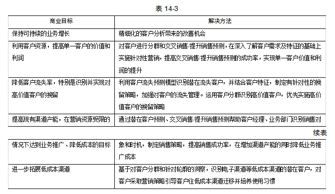 如表14-3所示,表中列出了一些实际的商业目标和解决方法。可以看到,无论是客户价值深挖、客户保留、渠道优化和降低成本、对分群客户的解决方法分析都是不可忽略的。