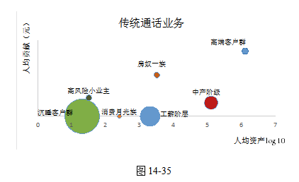这类客户分群方法在技术上和上例完全一样,但是使用的变量不再是RFM模型指标,而是对业务战略发展有指导意义的指标。比如,在分析现有客户结构、指明未来重点发展方向时,使用了如图14-35所示的两个指标。其中人均资产代表客户的长期价值,资产数额越高,代表为公司带来未来高收益的可能性越大;人均贡献代表的是客户的当前价值。由图14-35中可以看出,中产阶级的用户基数较高,人均资产较高。但是人均贡献低,还没有达到房奴一族的人均贡献。这表明该群体的需求还没有得到激发,或者公司目前的产品没有提供令他们满意的服务,需要在今后进行改进。