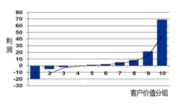 这可能是很多公司最早使用的客户分群方法,较为常见的是只根据客户对公司的利润贡献数额进行分群。比如,中国移动的VIP卡就是按照日平均话费来划分的。虽然全国各地的具体标准有所不同,但是分类方法基本一致。比如陕西部分城市,月平均话费在300元以上是银卡,700元以上是金卡,1700元以上是钻石卡。图14-28便是根据客户利润贡献进行划分的。
