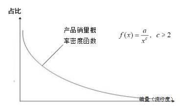 长尾理论是观察事物流行度的另一种视角。例如,一些不同品牌产品的占比与销量(流行度)的关系服从幂律分布,如图所示。
