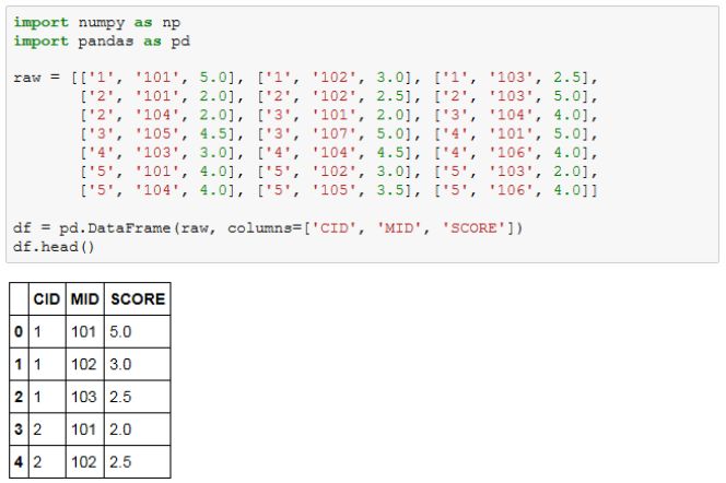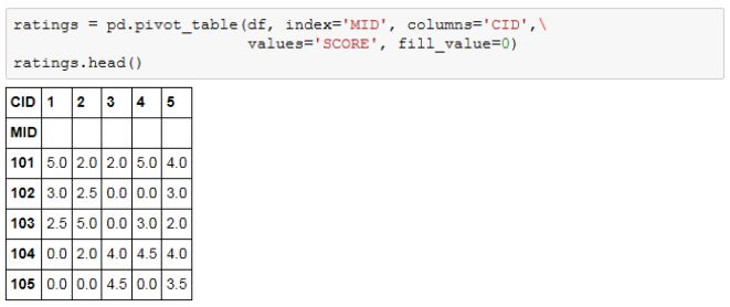 原始数据是在事务型数据库中常见的形式,为了计算各商品间的相似度,需要将其进行转换,生成评分矩阵如下: