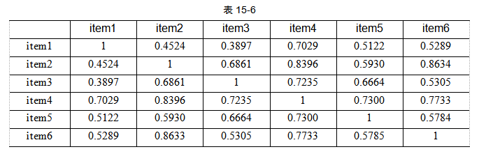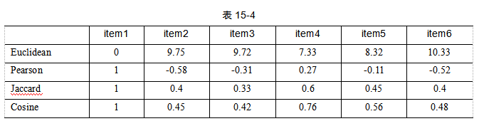 通过相似度的计算,就找到了相似的用户,从而可以进行下一步的推荐。除了计算用户相似度,数据集同样也可以使用相同的方法计算商品的相似度,以item1为例,计算出的相似情况如表15-4 所示。
