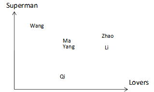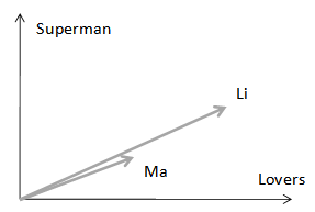可以看到Li比Ma更容易对商品给出高分,但相对来说,他们都更喜欢Lovers商品胜过Superman,可以说他们的偏好是很相似的(对应的夹角余弦值很接近于1)。