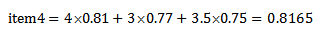 这个矩阵便是商品的相似度矩阵,基于商品的协同过滤会以商品的相似度为权重,在本例中以用户zeng的商品打分为基础,计算商品推荐打分,例如用户zeng 未打分的商品item3,其计算公式应为