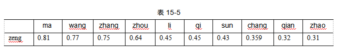沿用之前的数据,对于新用户zeng,其对6 个商品的打分为4、1、0、0 、0、3,通过余弦距离计算出用户zeng与其他用户的距离从小到大排序表15-5 所示。