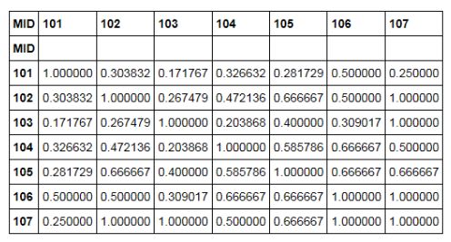 上述代码中,DistanceMetrics计算的是各个商品间的jaccard距离,要将其换算为jaccard相似度,只需要用1减去jaccard距离。如果采用其它距离公式,也同样需要先换算成相似度,可以认为相似度与距离是反比例关系,换算时用1减或者取倒数都是常用的方法。