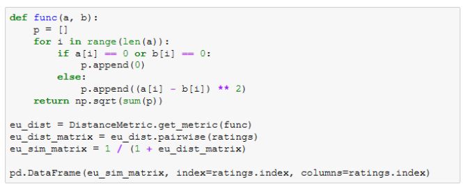 在使用欧式距离计算两项item间距离时,需要找到对这两项item都评过分的用户进行计算,而我们的评分矩阵中,分为“0”实际上是代表没有评分,因此不能直接使用欧式距离公式,需要我们自定义一个,然后使用DistanceMetric进行生成距离矩阵: