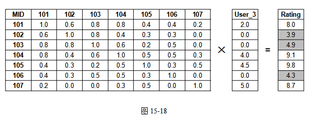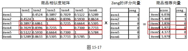 同理,可以计算出所有商品的推荐打分,以矩阵形式写出,如图15-17所示。