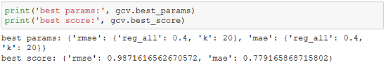 示例中,我们读取开源的电影评分数据集MovieLens,这需要在Reader中指定了文件格式(包含用户user、物品item、评分rating、时间戳timestamp四个变量,采用tab键'\t'作为分隔符),然后使用Dataset.load_from_file方法就可以从文件中将需要的数据解析出来了。因为该数据集已经内置在surprise当中,所以也可以直接使用Dataset .load_builtin('ml-100k')进行装载。在数据正常读取后,我们使用了GridSearchCV,以3折交叉验证的方式对param_grid中的参数进行搜索,判断标准为rmse和mae,搜索结果可以使用如下代码展示: