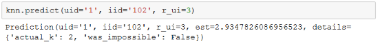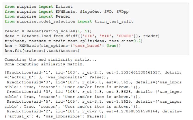 要读取评分数据,首先需要初始化一个Reader对象——读取DataFrame是该对象的参数设置很简单,只需指定评分的值域范围即可。读取的数据是一个默认进行k折交叉验证的可迭代类型,因此为了训练可以使用train_test_split将数据集切分为训练集和测试集,然后使用fit进行模型训练——与scikit-learn十分相似。训练好的模型可以使用test进行测试,或者使用predict进行预测: