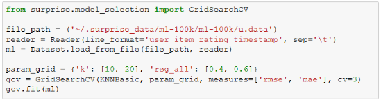 在实际工作当中,推荐模型的训练集一般可以从文件中直接读取,并以交叉验证的方式搜索最优超参数。为了更贴近实际情况,我们给出这样的一个示例如下: