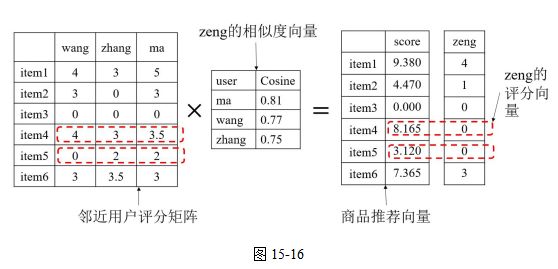 同理,可以计算出所有商品的推荐打分,以矩阵形式写出,如图15-16所示。