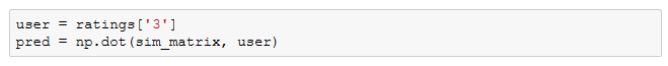 我们以第三个用户为例进行推荐,将其评分向量提取出来与相似度矩阵进行点乘,得到该用户的预测评分pred。