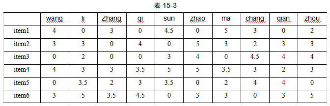 在得到每个用户的偏好后,就可以进一步分析用户之间的相似情况。以一个超市数据为例,这个超市收集了N 个用户购买M个商品后的评价记录,数据如表15-3所示。