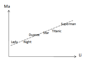使用皮尔森相关系数进行相似度衡量时,其优点在于有助于克服所谓的“夸大评价”现象对结果的影响,例如下图中,虽然Li对电影的评价比Ma更为极端(更容易给出高分和低分),但这个坐标系中的点相当靠近拟合曲线(图中虚线),可以认为两人品味偏好比较接近。