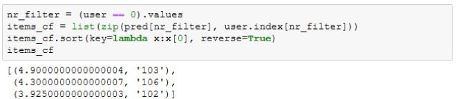 接下来,将用户已经评过分的商品过滤掉,剩下对未评分商品的预测,按照预测分值的高低进行排序,对预测评分较高的商品优先进行推荐: