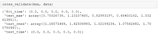 此处cross_validate中传入的参数需要是一个自动K折验证的数据集(即从DataFrame或文件中读取的包含全部评分数据的对象)。cross_validate返回的验证结果可以看到5折交叉的验证集上的RMSE从1.021到1.700不等。