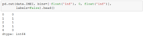 对于示例数据集当中的"IMEI"字段是手机串码(原本为15位),一部移动设备对应一个,是全球唯一的,这样的字段与ID字段一样无法进入模型。通过观察,发现有大量的记录IMEI为空值(现已填补为0),因此可以将有IMEI的设置为1,没有的设置为0。在scikit-learn的preprocessing中,使用Binarizer可以将字段二值化,示例如下: