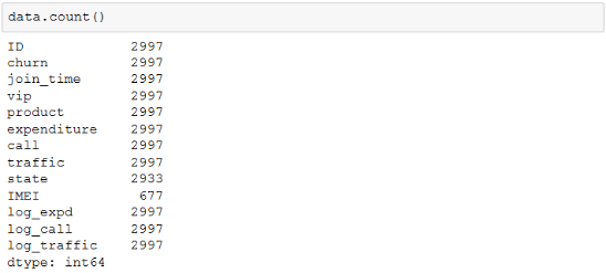 缺失值在页面上显示为NaN,意味着Not a Number,等价于numpy当中的空值NaN。缺失值的出现是非常普遍的,在pandas当中,对DataFrame进行count计数,不会统计其中的缺失值,因此可以使用该方法来判别哪些字段上有缺失值以及缺失的数量(除非所有字段都有缺失值,这种情况不多见,一般ID识别号是不会有缺失的),如下所示: