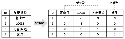 哑变量又称虚拟变量或虚设变量,一般使用0和1来表示分类变量的值是否处于某一分类水平,例如账户ID1~4的办理渠道如图18-1左图所示,进行哑编码后用0和1来表示各记录是的具体取值情况,如图18-1右图所示: