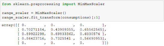 scikit-learn当中可以使用preprocessing.Normalizer对每一行进行规范化,仅仅是为了演示代码,我们将通信账单数据集的后三列提取出来,使用规范化方法进行转换如下: