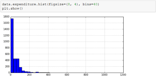 对于月消费额这样的数据绘制直方图,可以发现其明显右偏,代码如下。