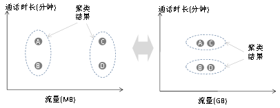 同样的样本点,如果流量采用MB为单位,则A\B为一个簇,C\D为一个簇;如果使用GB为单位,则A\C一个簇,B\D一个簇。可见因为单位不同对模型的结果会产生颠覆性的影响。