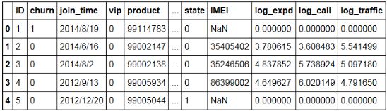 下面通过对一份手机用户通话账单进行处理来演示特征工程的各步骤,原始数据包含了1个属性,包括了ID、是否流失、入网时间、是否VIP、套餐编号、月消费、月通话时长、月流量消耗、用户状态及手机串号,数据集如下所示: