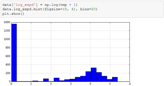 上述代码中使用了np.log函数,传入的参数正是原始数据+1后的结果。numpy中定义了一个函数log1p可以产生同样的效果。