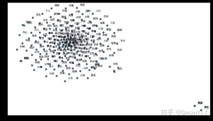 其中每个词语均被表示为1024维的向量(维度是不是有点高?之前看到的都是几百维的),再用t-SNE可视化高维词向量数据。先来看看降维至2维时的效果,大部分都分布在一起,没有想象中语义相关、相似的词语聚集在一起,不太相关的分散较远的效果,可能是百度云AI训练word2vec所用的语料不够相关所致?