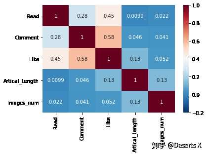 接着看下配图数量与文章长度会对阅读量、点赞数、评论数有什么影响吗?用seaborn库分别绘制heatmap图和pairplot图可知,仅评论数和点赞数,阅读量和点赞数线性相关性稍强。