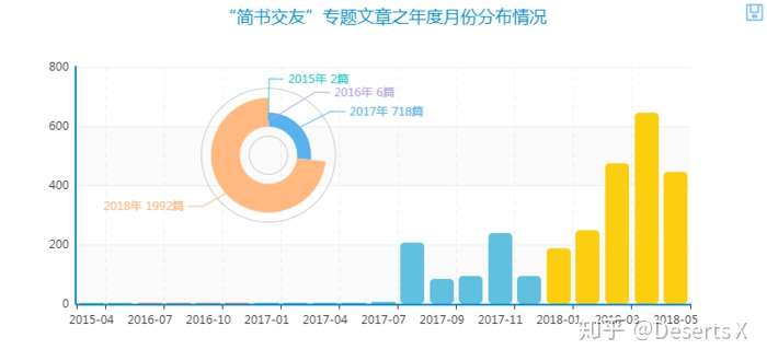 首先看看爬取的文章都是发布于哪年哪月的?套用以前用来可视化的ECharts3代码模板:图表太丑怎么破,ECharts神器带你飞!,可以清楚的看到2018年文章占比数接近75%。可见简书上活跃的人还是不少的,该专题多次举办主题征文活动,看来反响也不错。
