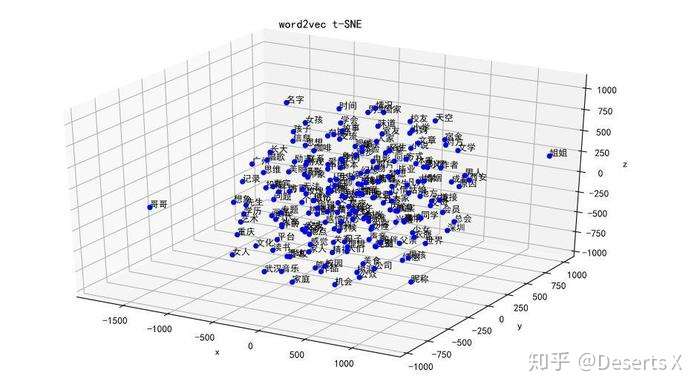 降至3维,依旧效果不佳,“哥哥”、“姐姐”两个词分散的较远,也是有些摸不着头脑,但发现“哥哥”--“女人”与“男人”--“姐姐”这两组距离上似乎较为接近......不可描述、不可描述......