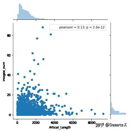 接下来看看文章字数与配图数之间的关系,两者不是直接提供的,但能分别计算出来,线性相关性不明显,但却发现有些文章配图数高达几十,挺让人惊讶的。