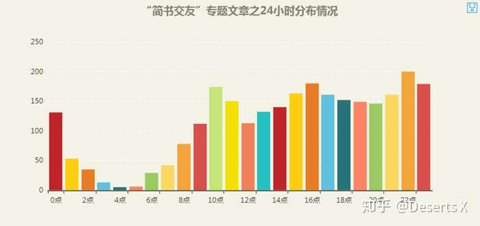 如果再看看文章发布时间的24分布情况,可以看出22点虽然小有高峰,但差距相对不大,除却1点至8点的睡觉时间,并没有明显的深夜寂寞寂寞,想交友的倾向==。