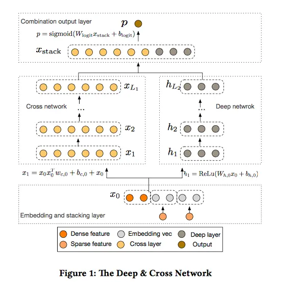 一个DCN模型从嵌入和堆积层开始,接着是一个交叉网络和一个与之平行的深度网络,之后是最后的组合层,它结合了两个网络的输出。完整的网络模型如图: