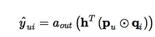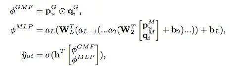 结合GMF和MLP,得到的就是第三种实现方式,上图是该方式的完整实现,输出层的计算公式为: