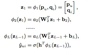 上图中仅使用右侧的MLP Layers,就得到了第二种学习方式,通过多层神经网络来学习user和item的隐向量。这样,输出层的计算公式为:
