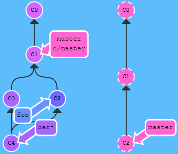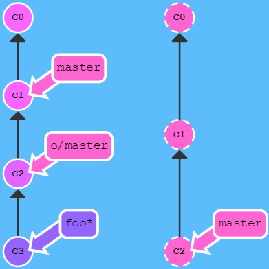 Git 将 foo~1 解析成一个 origin 仓库的位置,然后将那些提交记录下载到了本地的 bar 分支(一个本地分支,但我认为这里是本地的远程分支,即 origin/bar)上。注意由于我们指定了目标分支,foo 和 o/foo 都没有被更新。