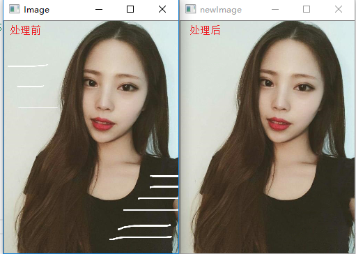 那OpenCV究竟是怎么实现的,简单的来说就是开发者标定噪声的特征,在使用噪声周围的颜色特征推理出应该修复的图片的颜色,从而实现图片修复的。
