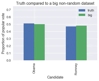 这是一个绘图,比较了非随机样本的比例与真实比例。 标有真实值的条形显示了,每位候选人收到的选票的真实比例。 标有“大”的条形显示了,我们 6000 万选民的数据集中的比例。