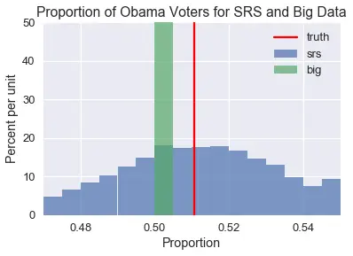 我们将比较大小为 400 的 SRS 和大小为 60,000,000 的非随机样本。我们的非随机样本比我们的 SRS 大近 15 万倍!由于 2012 年大约有 1.2 亿选民,我们可以将我们的非随机样本看作一个调查,其中美国所有选民的一半做出了回应(没有超过 10,000,000 个选民的实际调查)。