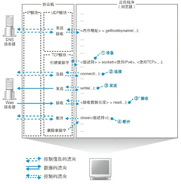 浏览器能够解析网址并生成HTTP消息,但它本身不具备将消息发送到网络的功能,因此这一功能需要委托操作系统来实现。在委托操作系统发送消息时,必须提供通讯对象的IP地址,而不是域名,因此在HTTP消息之后,我们需要根据域名查询IP地址。