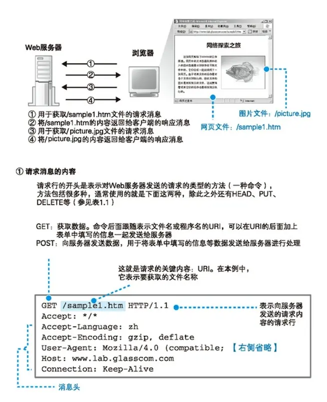 HTTP请求消息包含『对什么』和『进行怎样的操作』两个部分。 其中相当于『对什么』的部分称为URI。一般来说URI的内容是一个存放网页的文件名或者是一个CGI程序的文件名,例如"/dir/file.html"、"/dir/program.cgi"等。 其中『进行怎样的操作』的部分称为方法。方法表示需要让web服务器完成怎样的工作,其中典型的例子包括读取URI表示的数据、将客户端输入的数据传递给CGI程序等。