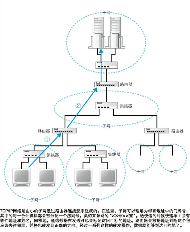 通过IP地址我们可以判断出访问对象服务器的位置,从而将消息发送到服务器。消息传送的具体过程在后面的章节有详细讲解,不过现在我们先简单了解一下。发送者发出的消息首先经过子网中的集线器,转发到距离发送者最近的路由器上(上图①)。接下来,路由器会根据消息的目的地判断下一个路由器的位置,然后将消息发送到下一个路由器,即消息再次经过子网内的集线器被转发到下一个路由器(上图②)。前面的过程不断重复,最终消息就被传送到了目的地。