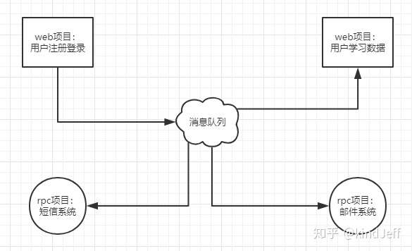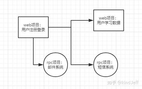 假设扇贝的系统架构是这样的(实际上并不是这样):处理注册请求的web server是一个web项目,而邮件系统和短信系统都是单独的rpc项目,另外存放学习数据的又是一个单独的web项目。