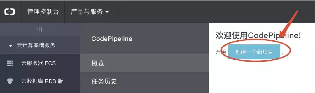 开通 CodePipeline 服务后可以开始创建一个新项目:管理控制台 -> 创建一个新项目。